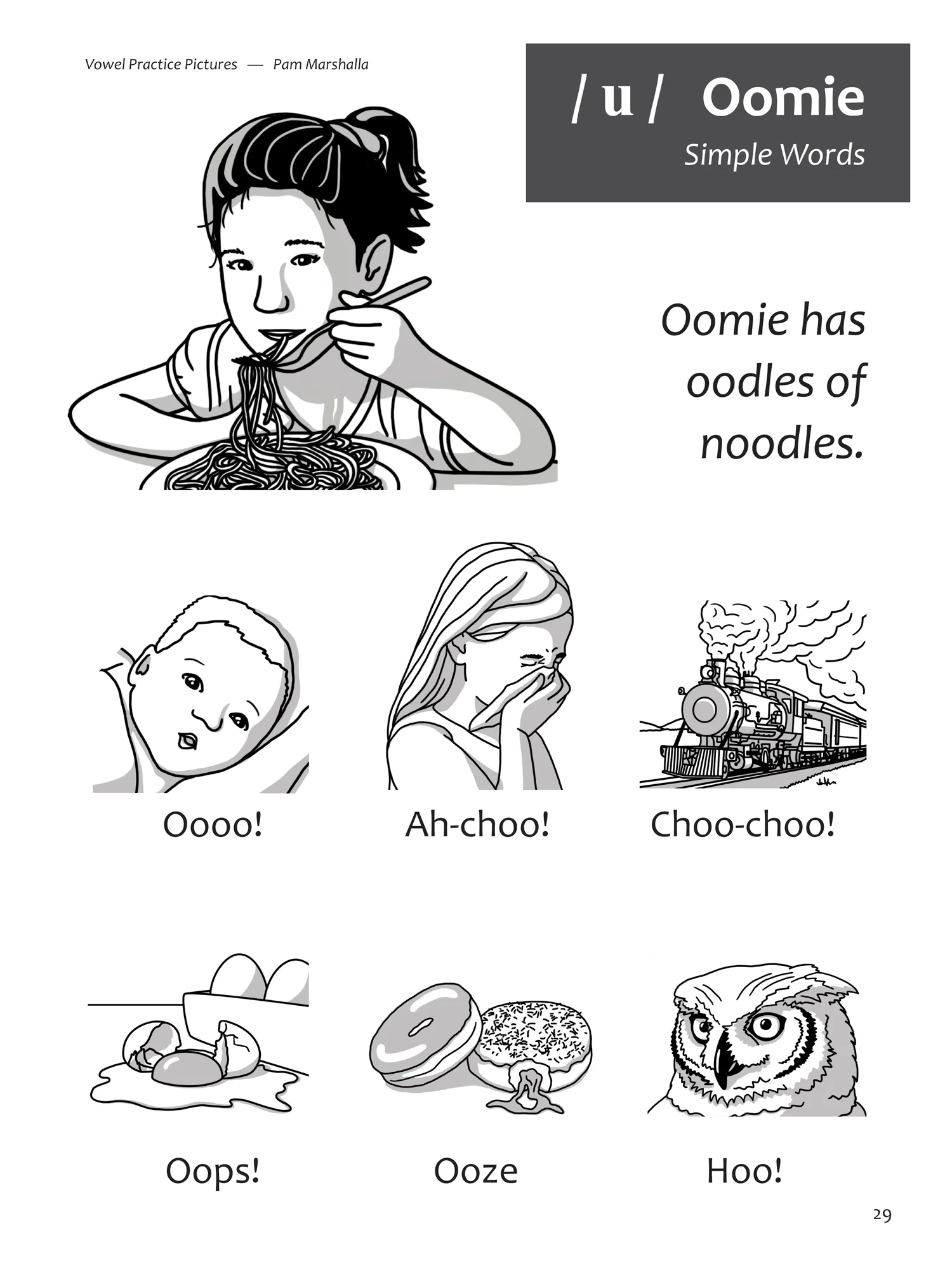 Vowel Practice Pictures contains 375 words carefully chosen for their vowel content, giving speech-language pathologists, teachers, and parents a quick resource for vowel practice. Each vowel is introduced with a main character and an action to engage young children, and every word is accompanied by an illustration. The target words contained in Vowel Practice Pictures have been chosen to represent all English vowels, arranged simple-to-complex by syllable shape and phonological pattern.